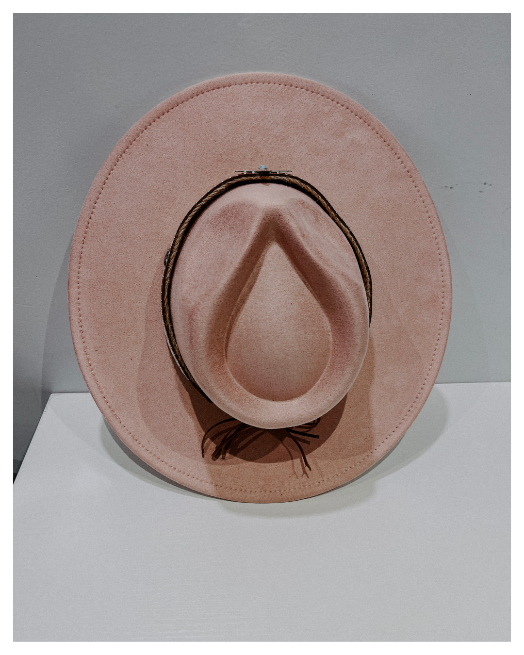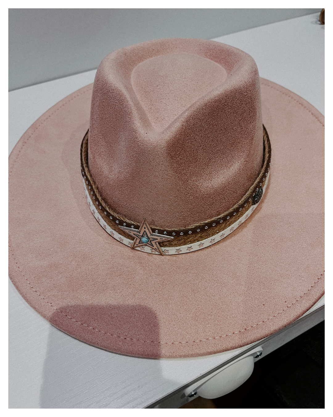 Soft blush meets Southern glam in this standout hat. Designed with a smooth suede finish and accented by a textured leather band, it shines with a detailed star concho featuring a turquoise stone. Feminine yet bold, this piece is perfect for pairing with boots, dresses, or your favorite festival outfit.