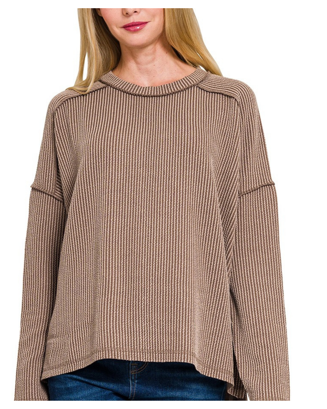 Made for crisp mornings and cozy nights, this raised rib knit top is your new fall favorite. The raw edge details and boat neckline give it a laid-back yet elevated look, perfect for everything from pumpkin patch days to holiday movie marathons. In a warm brown hue that feels right at home with the season, this top pairs effortlessly with denim, boots, and all your festive plans.