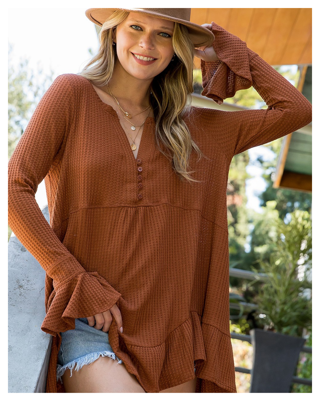 Cozy meets effortlessly chic in our Waffle Knit Flare Top. This flowy, oversized tunic is crafted from a soft thermal knit that feels as good as it looks. Designed with a relaxed fit and flared silhouette, it’s perfect for layering or wearing solo. The rich cinnamon hue adds warmth and charm to any outfit—whether you’re lounging at home or headed out for brunch. Pairs perfectly with your favorite denim or leggings.
