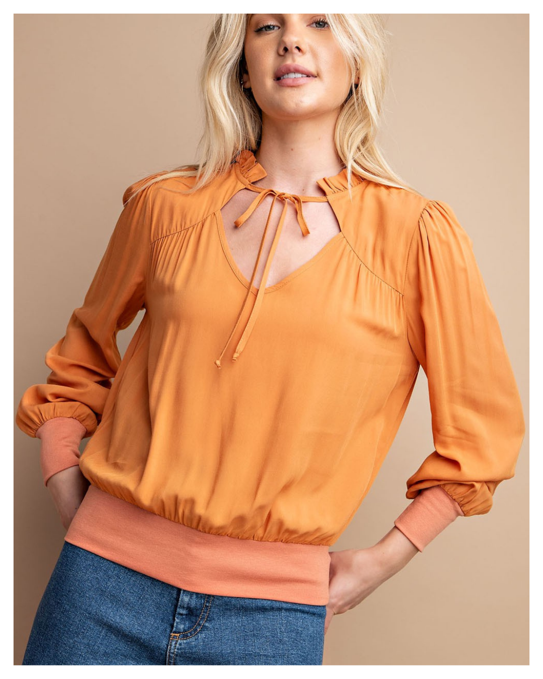 This mixed-fabric top blends woven and knit textures for a look that’s both elevated and easygoing. Delicate ruffle details add a touch of romance, while the adjustable front tie gives you styling flexibility. Light, airy, and effortlessly feminine—this top pairs beautifully with denim, skirts, or anything in between.