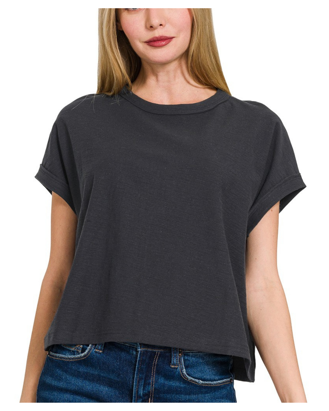 A classic staple with subtle texture, this cotton slub tee offers a soft, breathable feel and a flattering round neckline. Its short sleeves and relaxed fit make it an easy layering piece or a go-to on its own. In versatile black, it pairs perfectly with everything from jeans to skirts for effortless everyday style.
