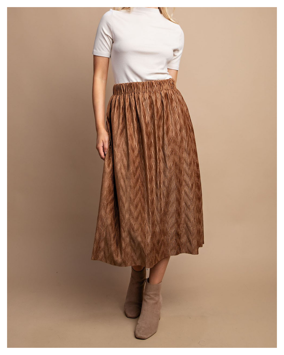 This mocha-colored midi skirt is designed with a soft textured fabric and a comfortable elastic waistband that flatters without fuss. Fully lined for a smooth silhouette, it moves gracefully and pairs effortlessly with everything from graphic tees to button-downs. A versatile piece that brings comfort and style together in one simple, elevated look.