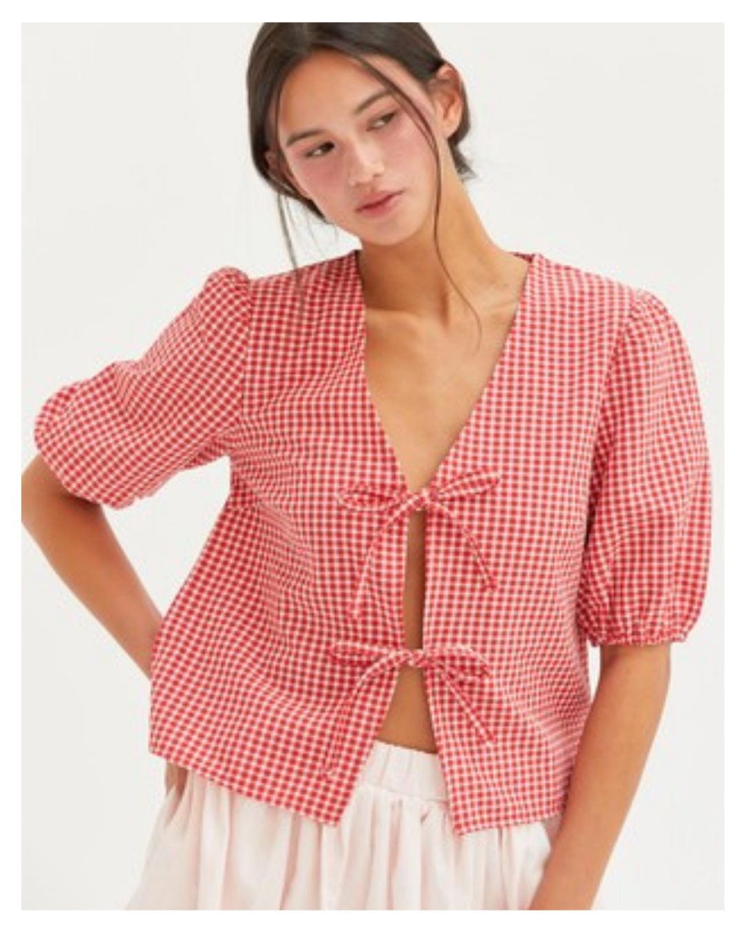 Every fashion girlie needs this charming gingham blouse! Designed with a trendy gingham print, it features short puff sleeves and a stylish front-open design. Delicate bow accents along the front add the perfect feminine touch, making it a must-have piece for any wardrobe.