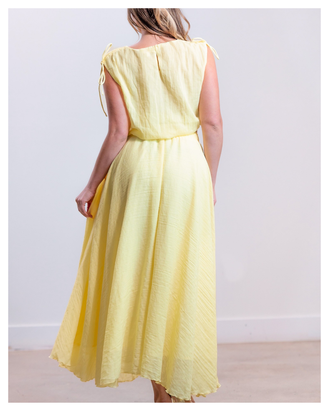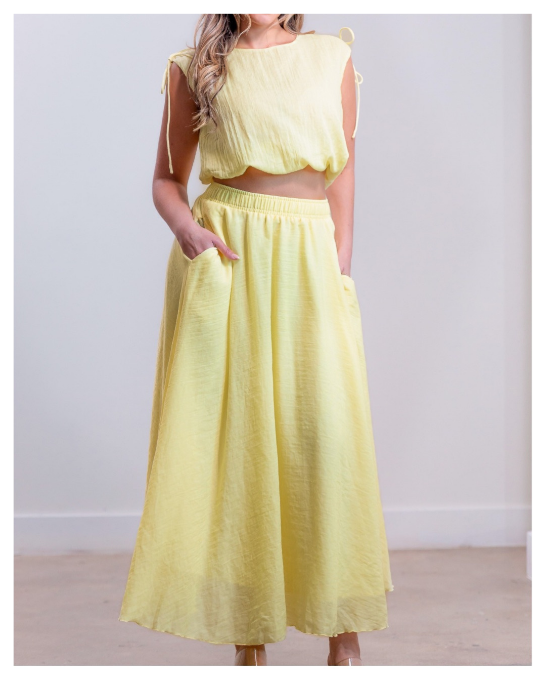 The Golden Hour Linen Set is the perfect blend of effortless elegance and breezy comfort. Crafted from lightweight linen gauze in a sunny yellow hue, this two-piece set features a sleeveless jewel-neck top with a delicate back keyhole button and drawstring shoulder details. The flowy maxi skirt boasts an elastic waist for a flattering fit, side pockets for functionality, and a soft lining with a touch of mesh for added dimension. Whether you're strolling the beach or enjoying a summer soirée, this fit-and-flare set is your go-to for chic, sunshine-ready style.