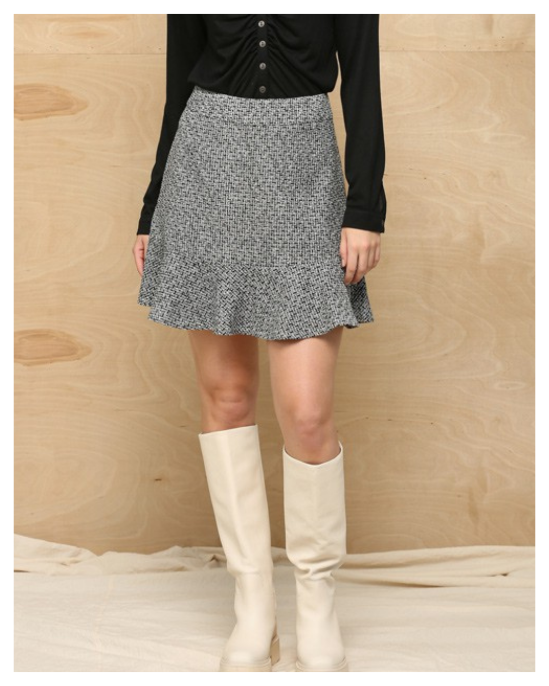 This flirty mini skirt brings timeless tweed into the now with a flattering flare and modern structure. The woven texture adds depth and polish, while the back zipper ensures a sleek, secure fit. Whether you’re pairing it with a tucked-in blouse or a slouchy sweater, this piece adds a touch of tailored charm to any look.