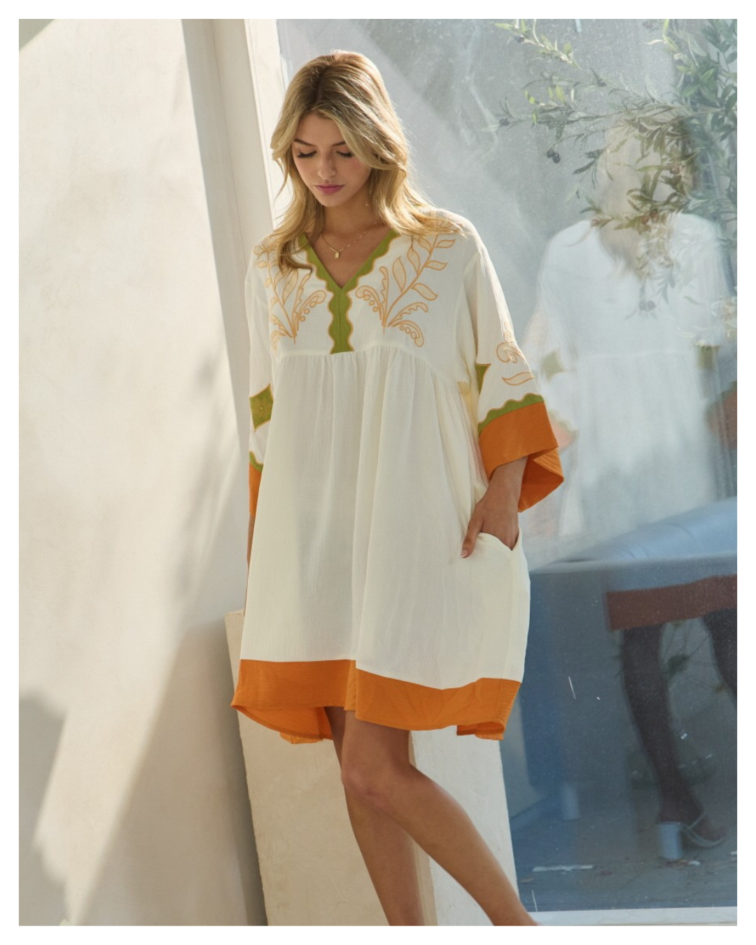 Turn heads in this Embroidered Plunge V-Neck Mini Dress. With intricate embroidery, a daring neckline, and bold contrast bands, this mini is equal parts playful and chic. Perfect for brunch dates, beach nights, or wherever the spotlight finds you.
