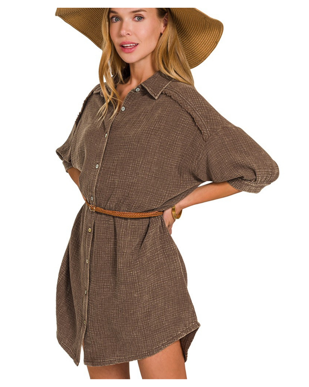 This 100% cotton shirt dress is your warm-weather go-to—lightweight, breathable, and made for movement. Crafted from ultra-soft washed double gauze, it features a relaxed fit, functional buttons, and a flattering curved hem that layers perfectly over shorts, leggings, or bare legs. The earthy brown tone channels rustic charm with a modern twist—whether you're wandering downtown or kicking back at the campsite.