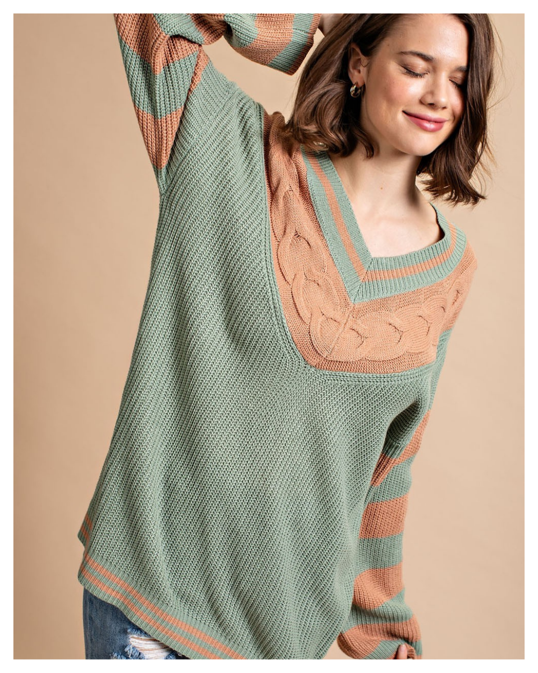 This standout sweater combines classic stripes with bold cable knit contrast for a look that’s anything but basic. The mixed textures add depth and interest, while the relaxed fit keeps it effortlessly comfortable. Perfect for cool days, layered looks, or adding a touch of statement style to your everyday rotation.