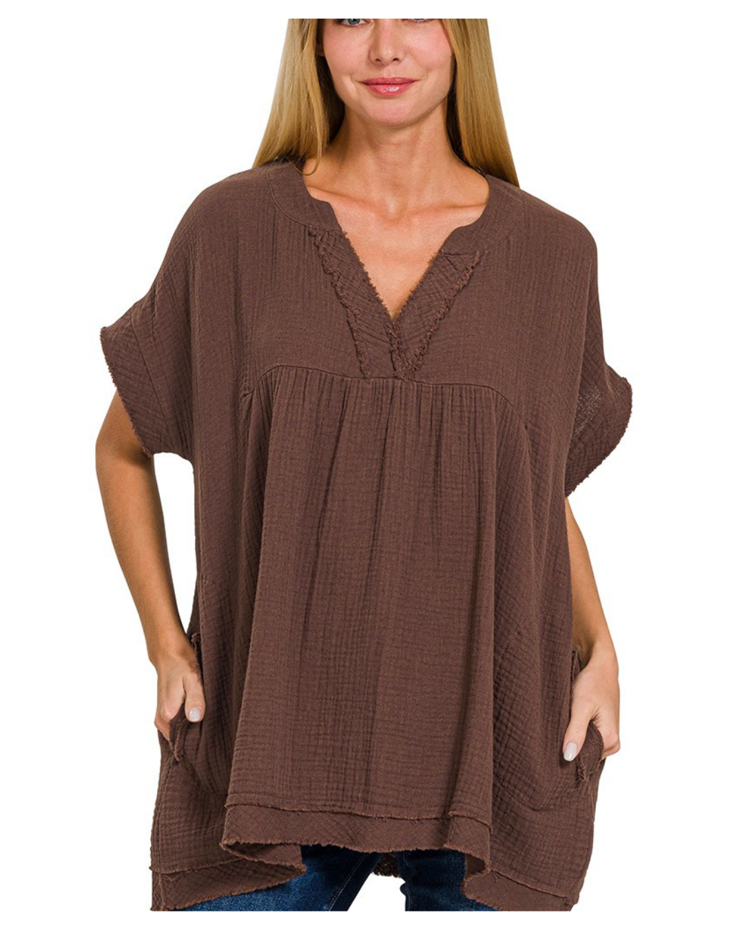 This lightweight v-neck shirt is made from breathable double gauze cotton that feels soft and effortless. The raw edge details add just the right amount of casual character, while the chest pocket gives it that easy, everyday functionality. With its relaxed fit and short sleeves, it's perfect for warm weather days or layering up with your favorite jacket when the breeze rolls in. A simple, go-anywhere staple with that worn-in charm you’ll reach for again and again.
