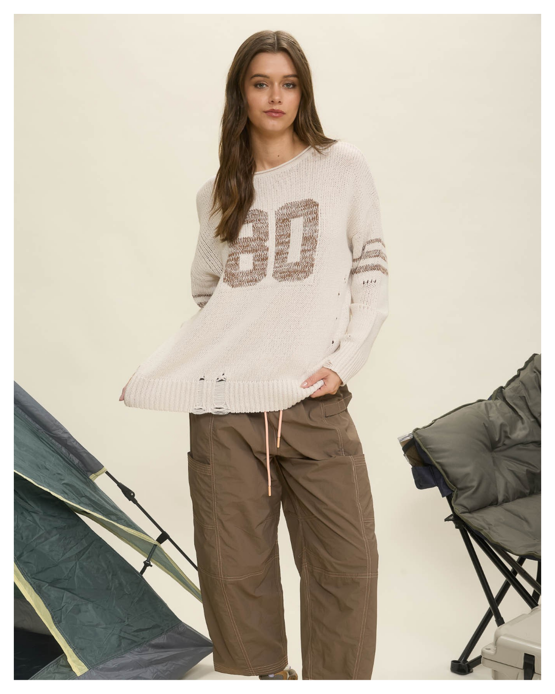 Varsity vibes with an edge—this relaxed-fit knit pullover is the perfect blend of sporty and laid-back. It features a casual boat neckline, drop shoulders, and long sleeves with bold varsity-style stripes. Distressed detailing throughout gives it that perfectly worn-in look, while the number graphic adds a classic athletic touch. Whether you're layering it up or keeping it casual, this top brings effortless style to any outfit.